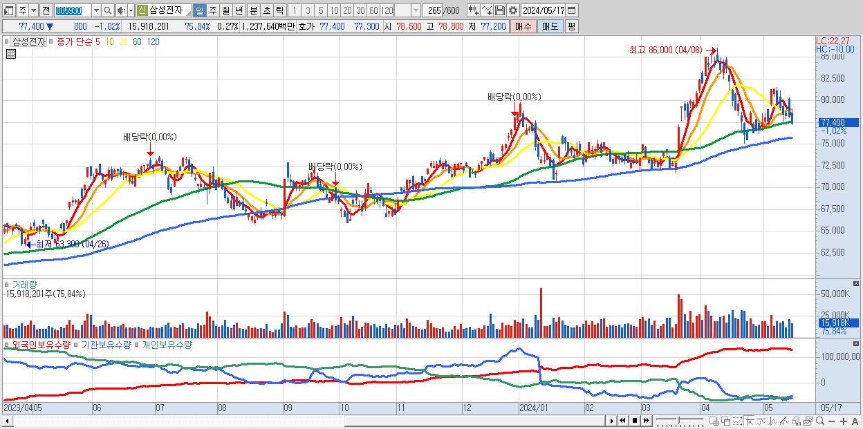 1.삼성전자 77,400원 ▼ -1.02% (KOSPI, 005930)