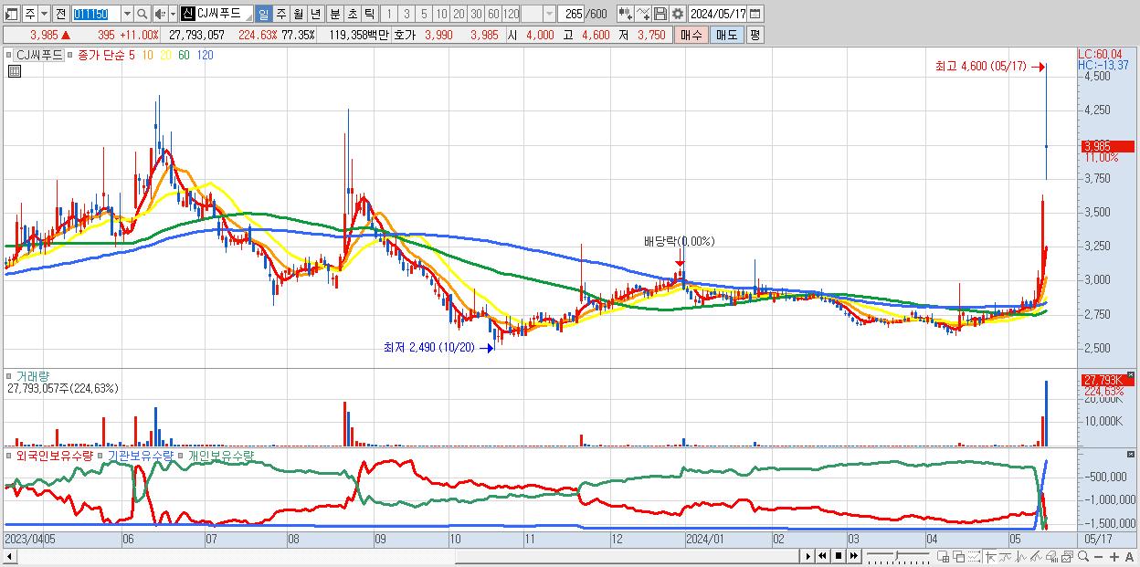 - CJ씨푸드 (3,985원 ▲ 11% , 시총: 1,432억, 거래량: 27,793,057, 거래대금:1,194억)