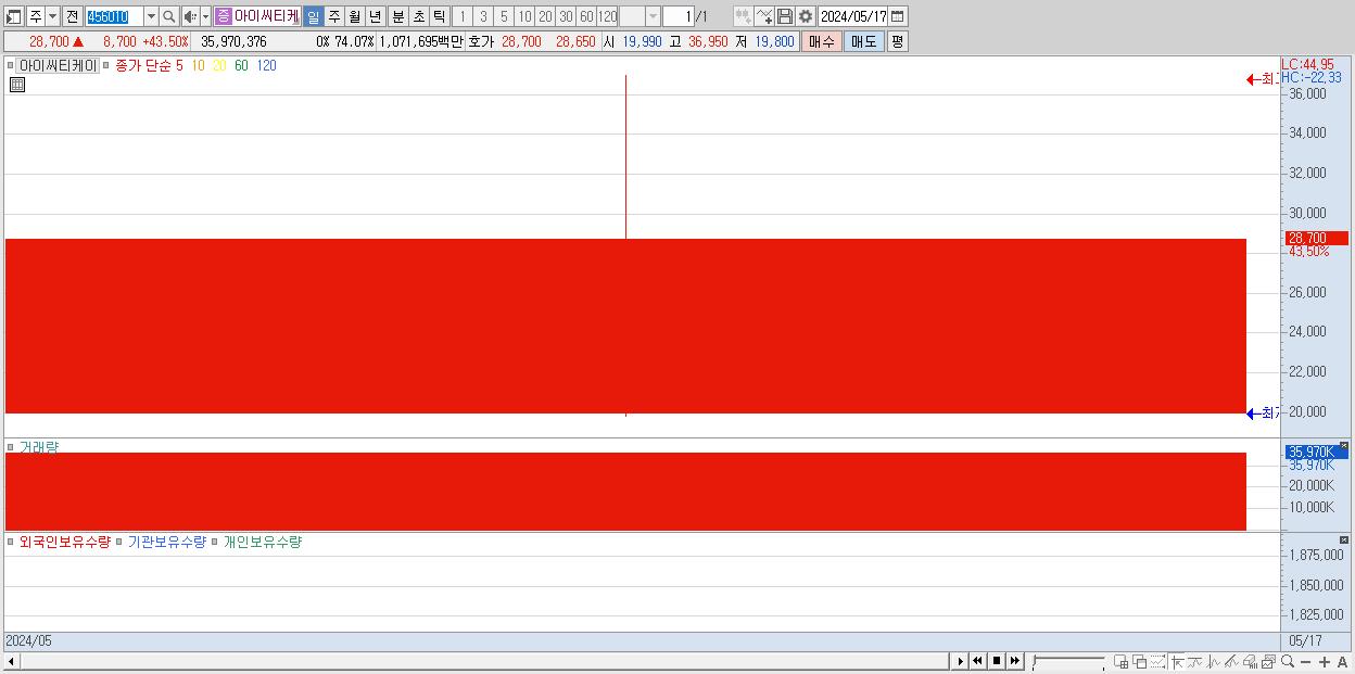 - 아이씨티케이 (28,700원 ▲ 43.5% , 시총: 3,767억, 거래량: 35,970,376, 거래대금:10,717억)
