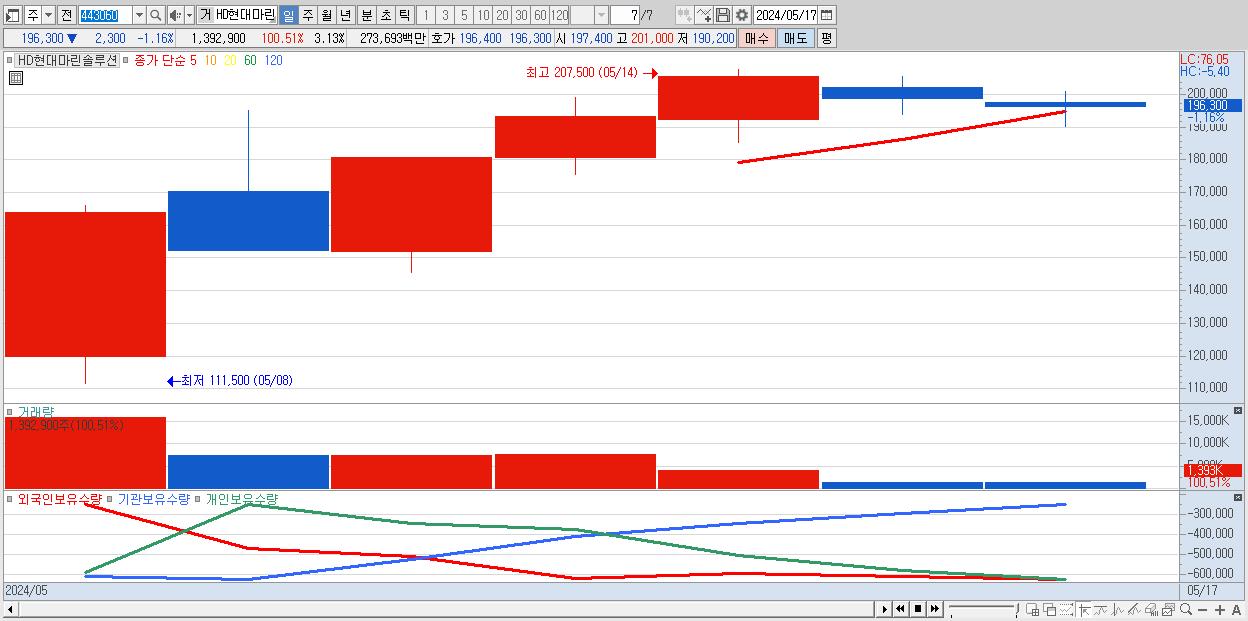 - HD현대마린솔루션 (196,300원 ▼ -1.16% , 시총: 87,255억, 거래량: 1,392,900, 거래대금:2,737억)