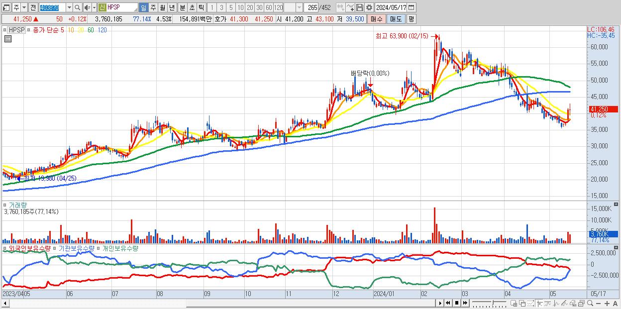 - HPSP (41,250원 ▲ 0.12% , 시총: 34,210억, 거래량: 3,760,185, 거래대금:1,549억)