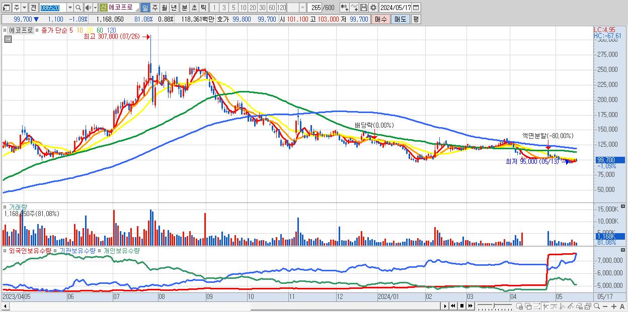 - 에코프로 (99,700원 ▼ -1.09% , 시총: 132,739억, 거래량: 1,168,050, 거래대금:1,184억)