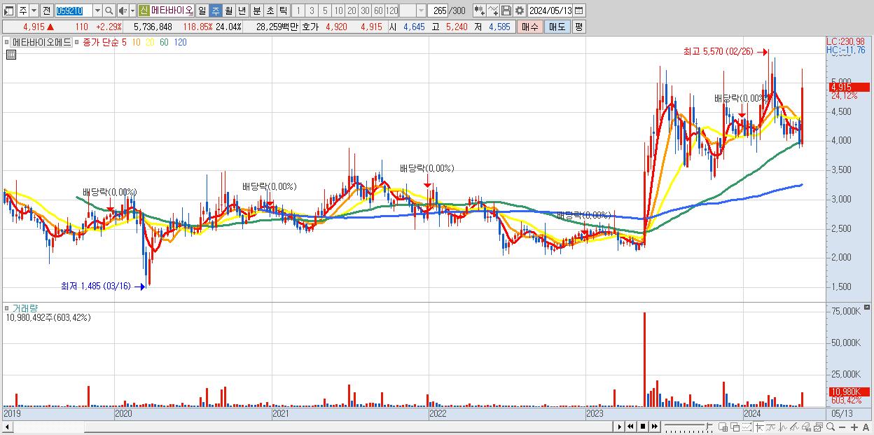 - 메타바이오메드 (4,915원 ▲ 24.12% , 시총: 1,173억, 거래량: 10,980,492, 거래대금:522억)