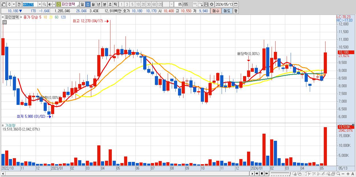 - 파인엠텍 (10,180원 ▲ 21.62% , 시총: 3,759억, 거래량: 19,518,360, 거래대금:1,938억)