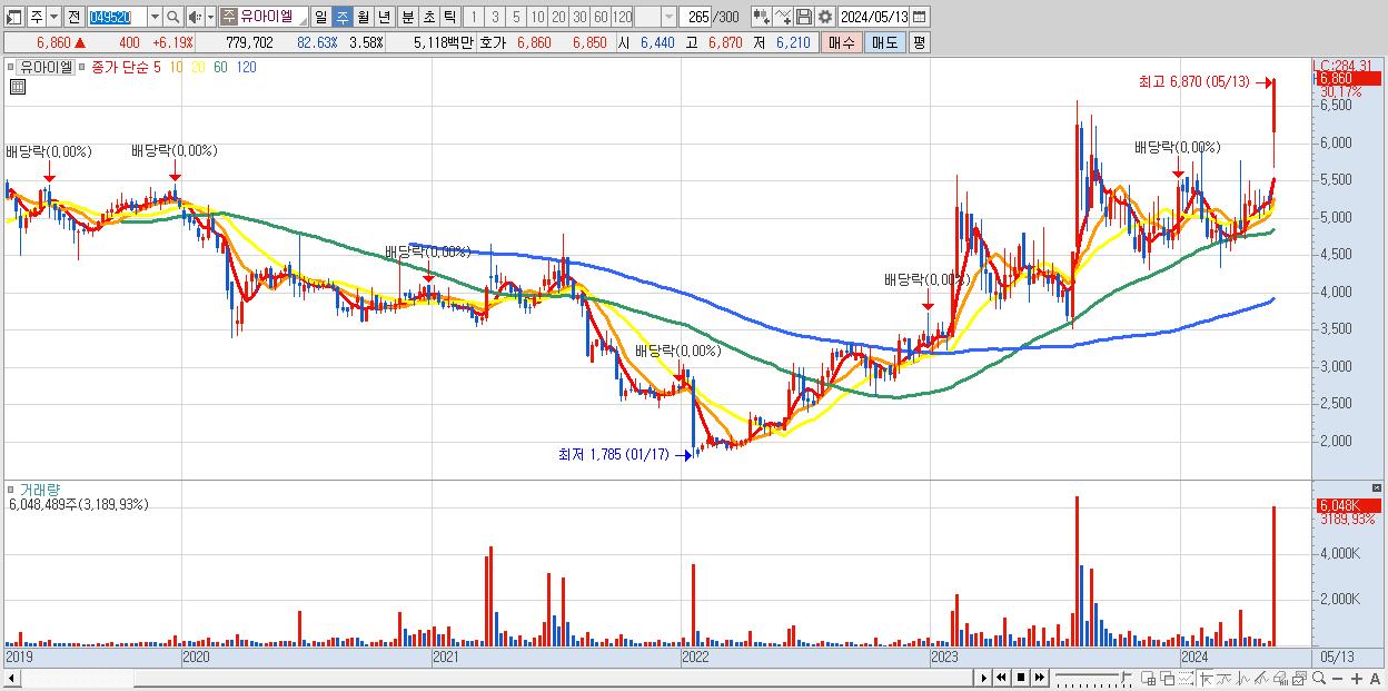 - 유아이엘 (6,860원 ▲ 30.17% , 시총: 1,494억, 거래량: 6,048,489, 거래대금:373억)