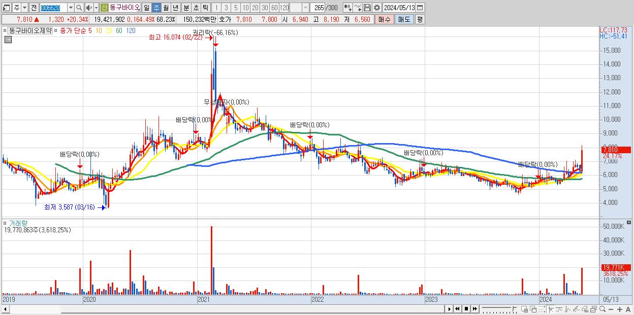 - 동구바이오제약 (7,810원 ▲ 24.17% , 시총: 2,223억, 거래량: 19,770,863, 거래대금:1,525억)