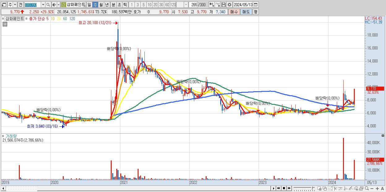 - 삼화페인트 (9,770원 ▲ 32.03% , 시총: 2,658억, 거래량: 21,566,074, 거래대금:1,920억)