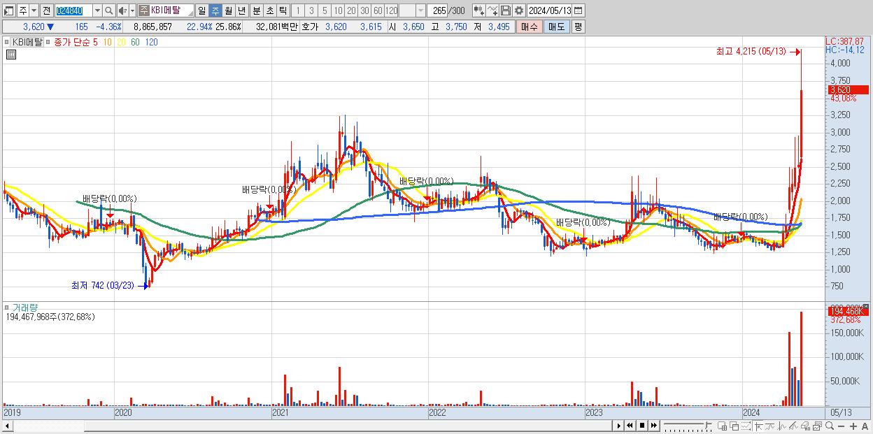 - KBI메탈 (3,620원 ▲ 43.08% , 시총: 1,241억, 거래량: 194,467,968, 거래대금:6,907억)