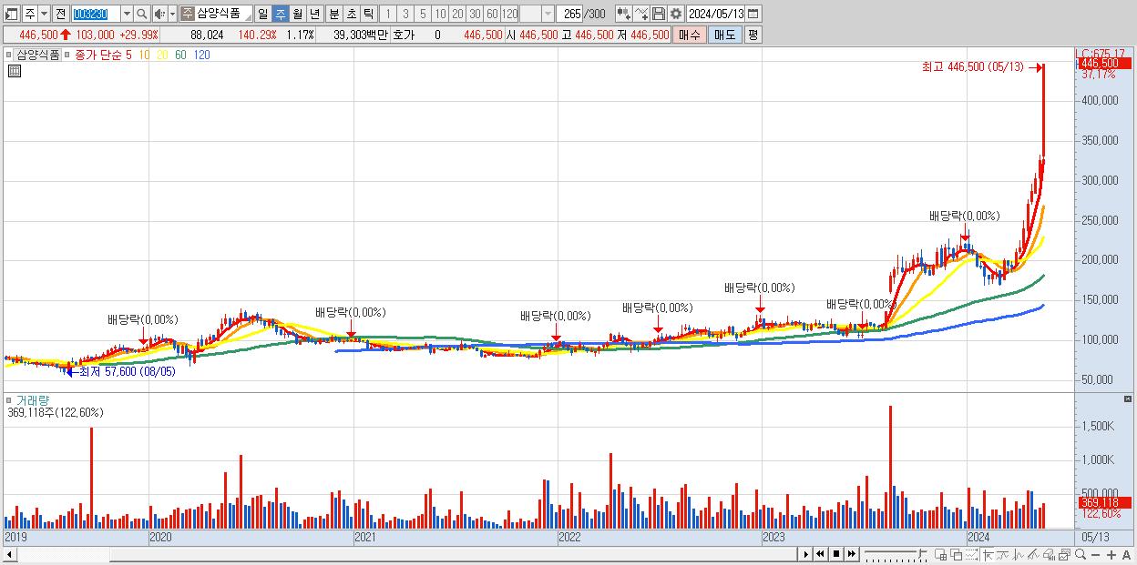 - 삼양식품 (446,500원 ▲ 37.17% , 시총: 33,635억, 거래량: 369,118, 거래대금:1,343억)