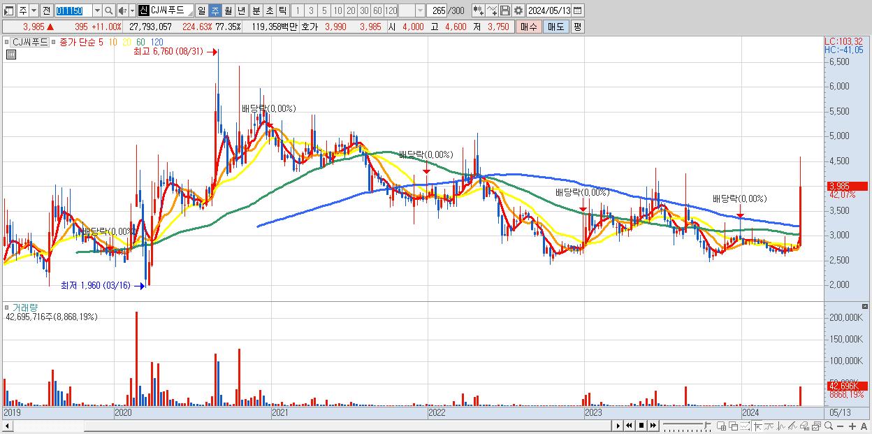 - CJ씨푸드 (3,985원 ▲ 42.07% , 시총: 1,432억, 거래량: 42,695,716, 거래대금:1,695억)