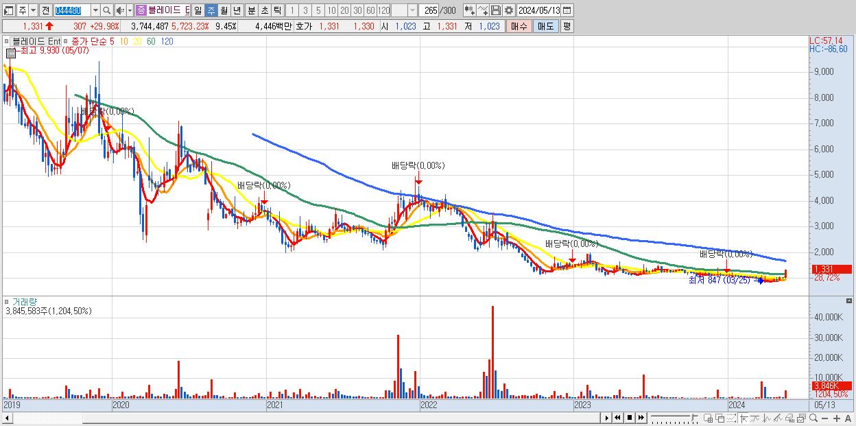 - 블레이드 Ent (1,331원 ▲ 28.72% , 시총: 528억, 거래량: 3,845,583, 거래대금:45억)