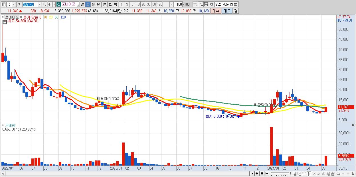 - 포바이포 (11,340원 ▲ 21.94% , 시총: 1,256억, 거래량: 8,668,507, 거래대금:966억)