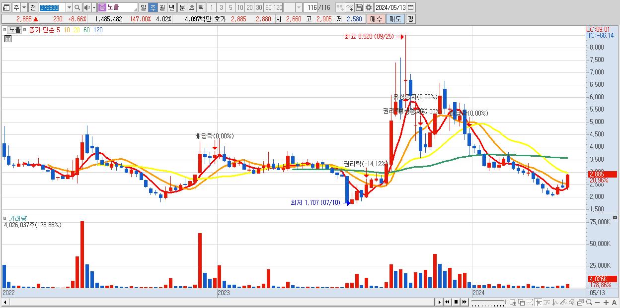 - 노을 (2,885원 ▲ 20.96% , 시총: 1,066억, 거래량: 4,026,037, 거래대금:105억)