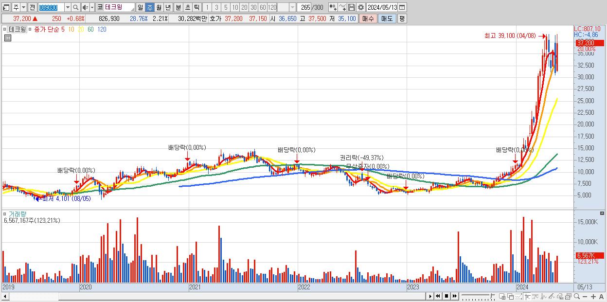 - 테크윙 (37,200원 ▲ 20% , 시총: 13,896억, 거래량: 6,567,167, 거래대금:2,324억)