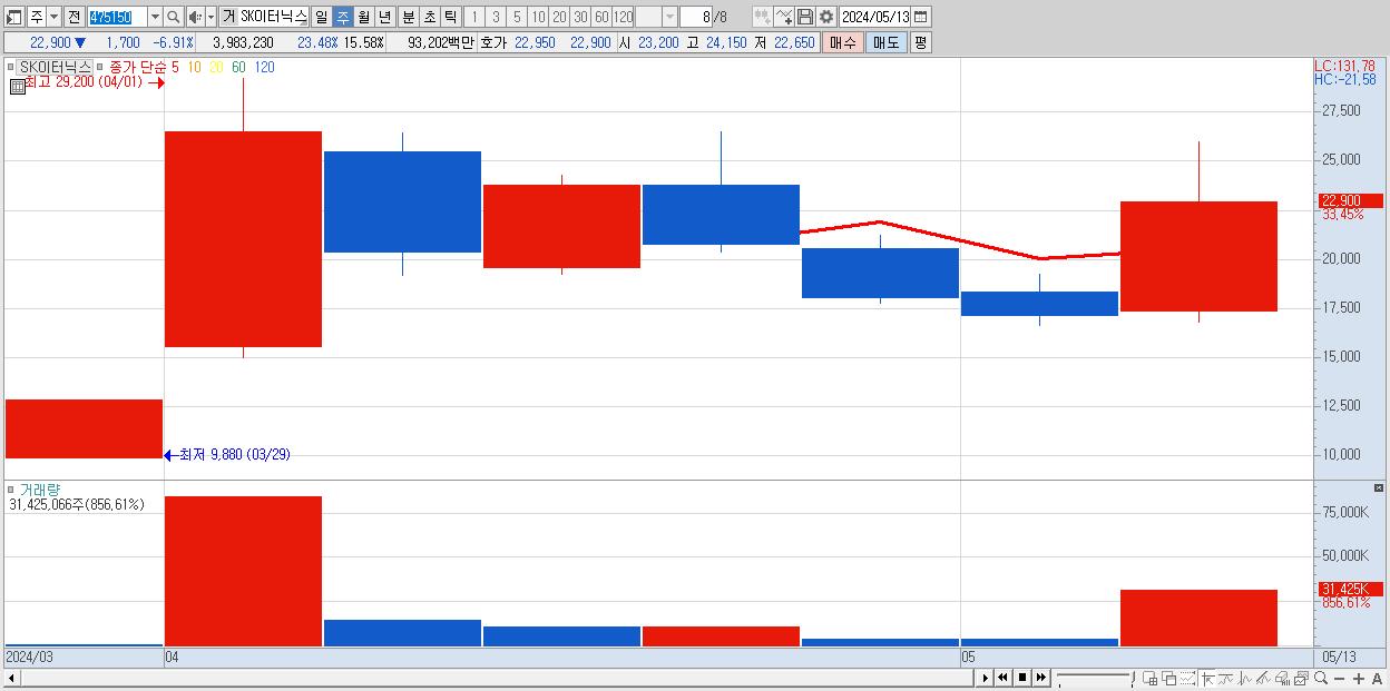 - SK이터닉스 (22,900원 ▲ 33.45% , 시총: 5,853억, 거래량: 31,425,066, 거래대금:7,191억)
