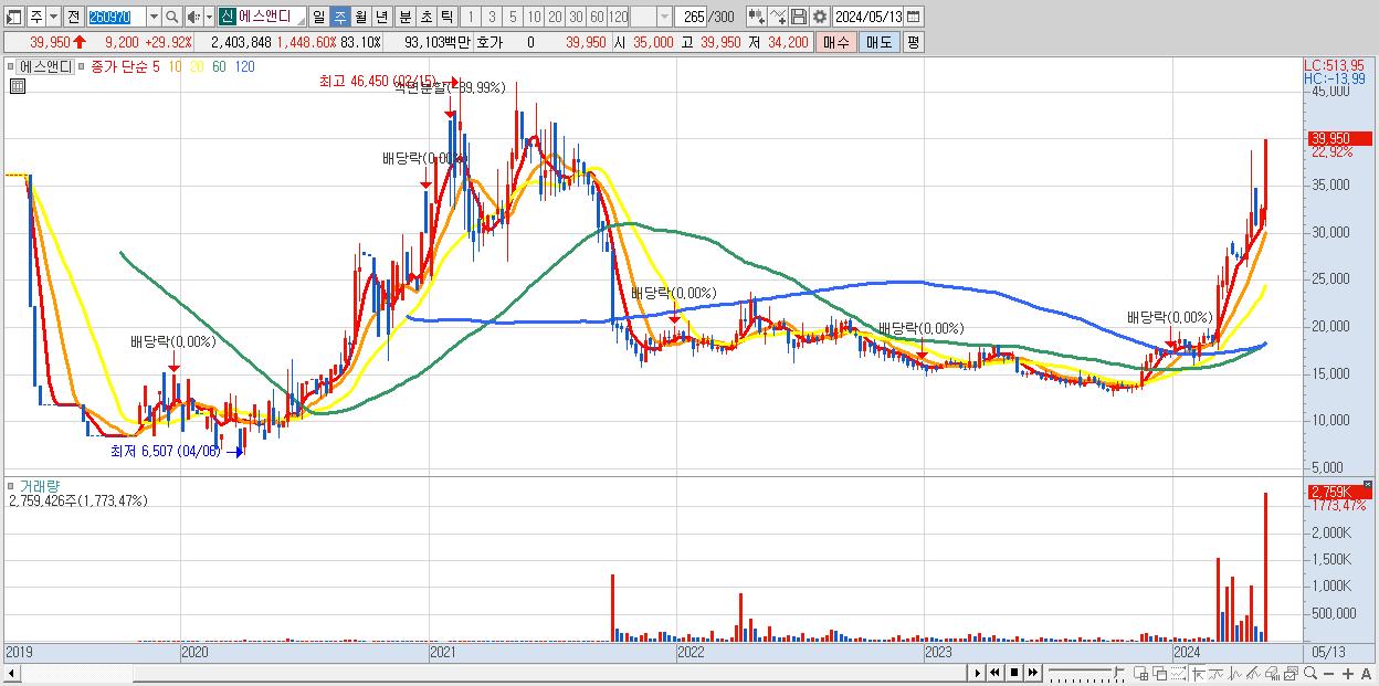 - 에스앤디 (39,950원 ▲ 22.92% , 시총: 1,156억, 거래량: 2,759,426, 거래대금:1,049억)
