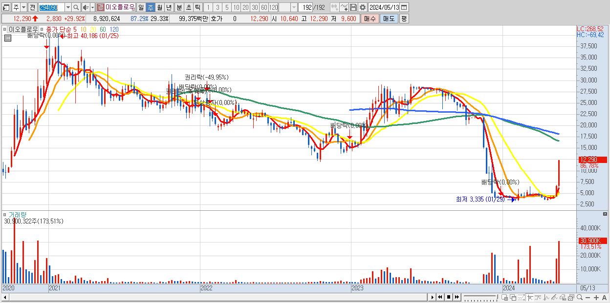 - 이오플로우 (12,290원 ▲ 86.78% , 시총: 3,738억, 거래량: 30,900,322, 거래대금:2,797억)