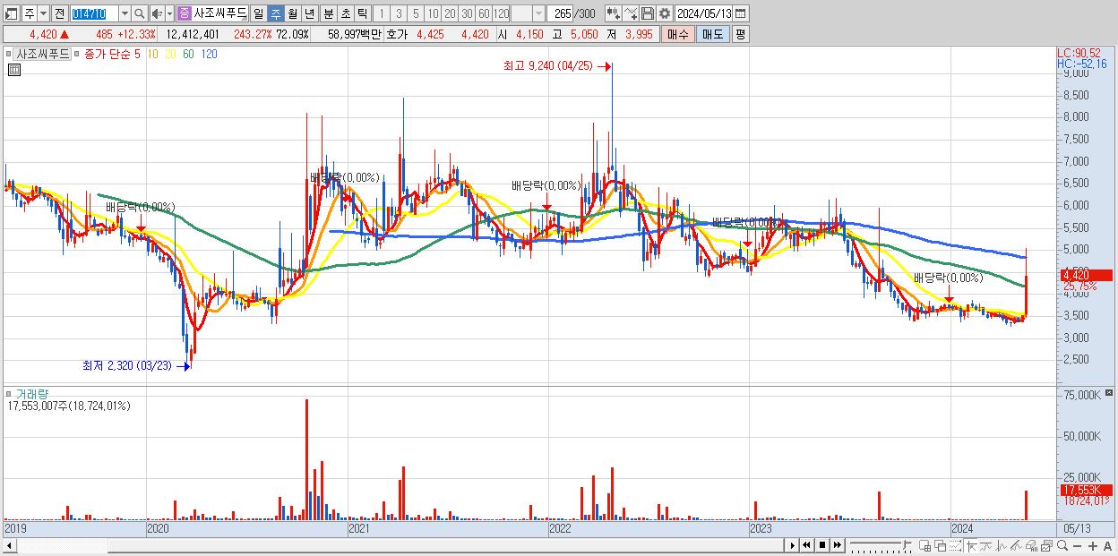 - 사조씨푸드 (4,420원 ▲ 25.75% , 시총: 761억, 거래량: 17,553,007, 거래대금:800억)