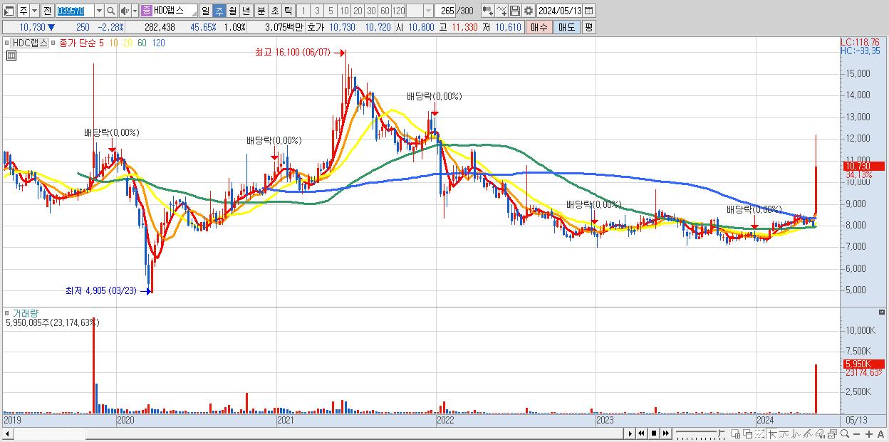 - HDC랩스 (10,730원 ▲ 34.13% , 시총: 2,785억, 거래량: 5,950,085, 거래대금:624억)