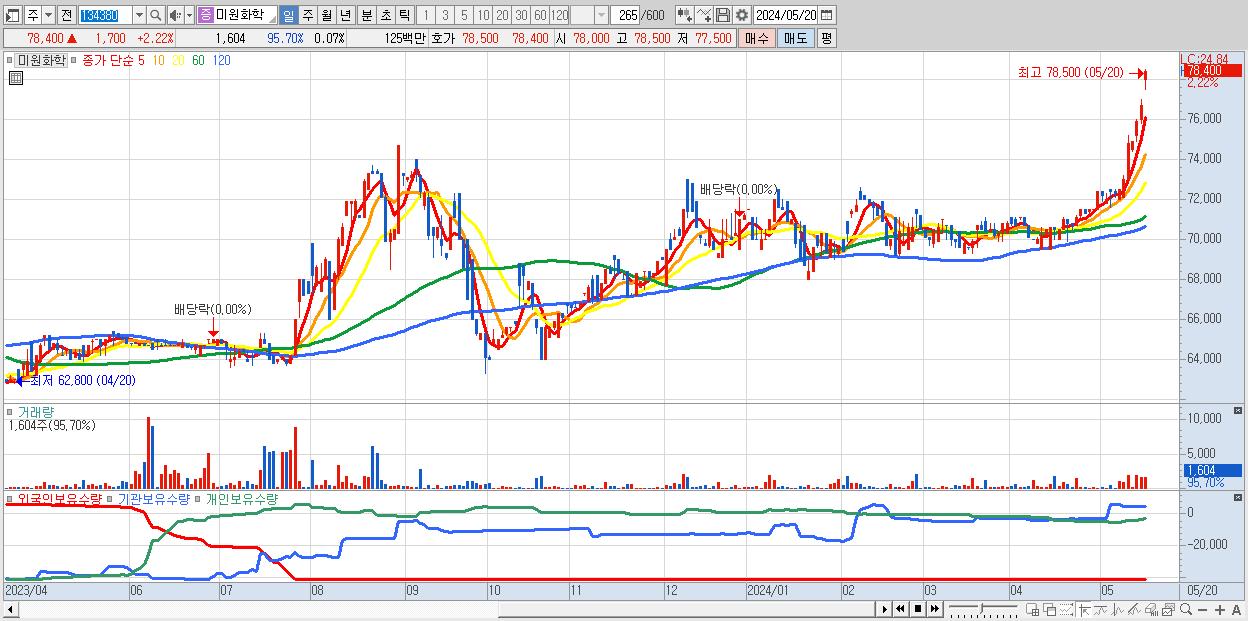 - 미원화학 (78,400원 ▲ 2.22% , 시총: 1,724억, 거래량: 1,604, 거래대금:1억, KOSPI)