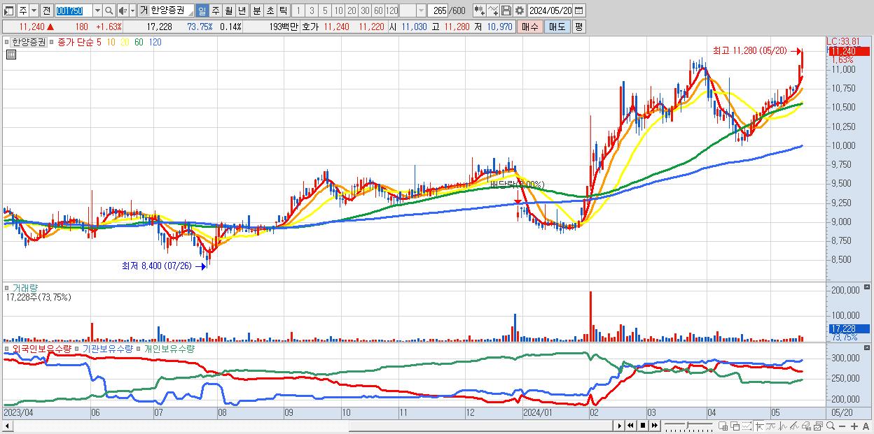 - 한양증권 (11,240원 ▲ 1.63% , 시총: 1,431억, 거래량: 17,228, 거래대금:2억, KOSPI)