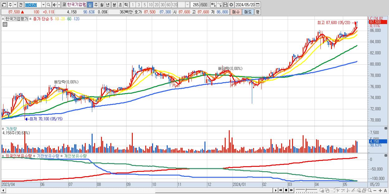 - 한국기업평가 (87,500원 ▲ 0.11% , 시총: 3,973억, 거래량: 4,158, 거래대금:4억, KOSDAQ)