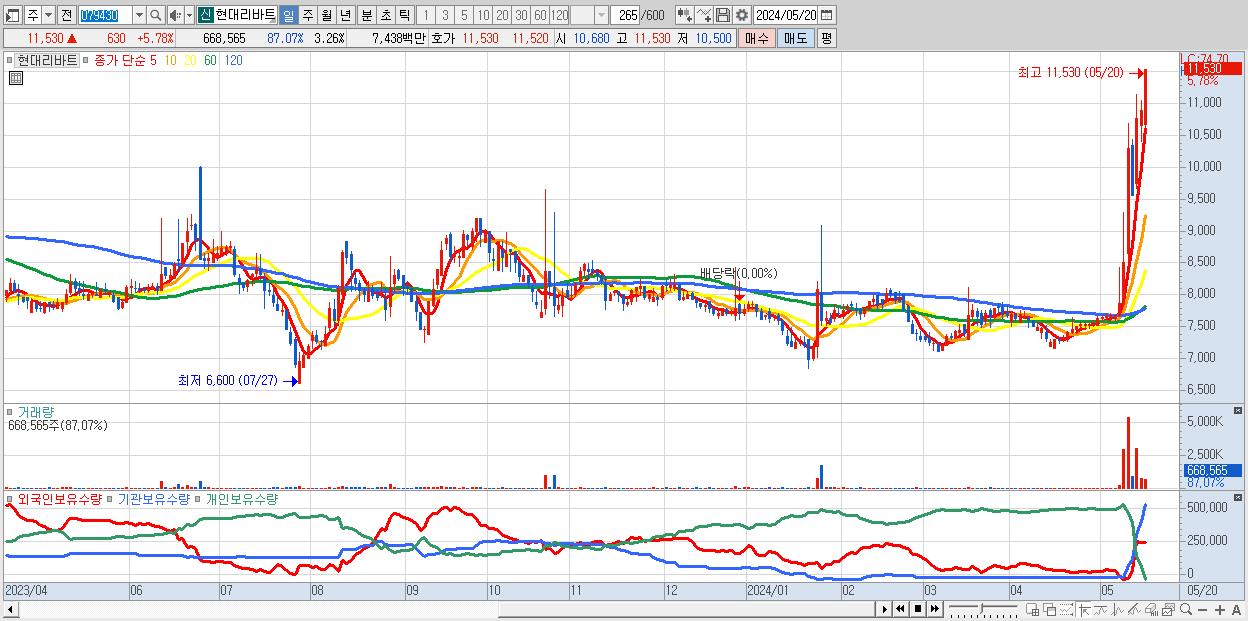 - 현대리바트 (11,530원 ▲ 5.78% , 시총: 2,368억, 거래량: 668,565, 거래대금:74억, KOSPI)