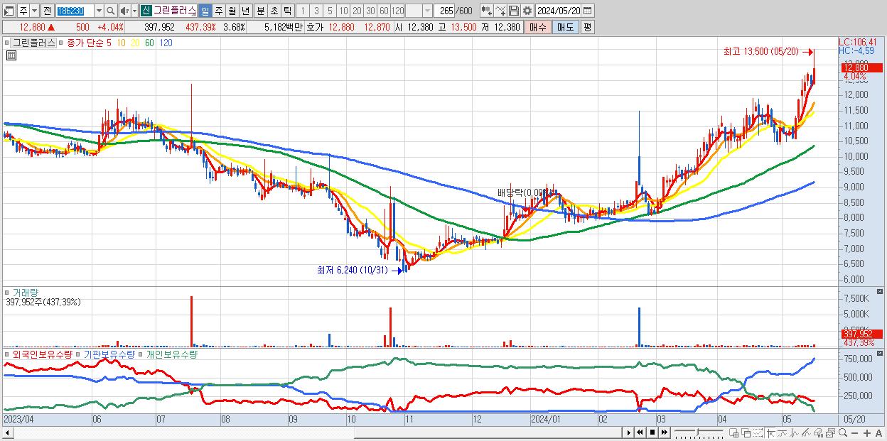 - 그린플러스 (12,880원 ▲ 4.04% , 시총: 1,394억, 거래량: 397,952, 거래대금:52억, KOSDAQ)