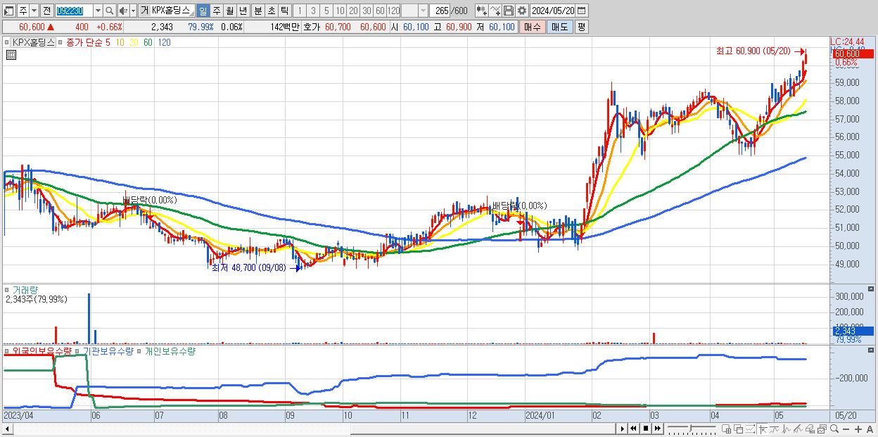 - KPX홀딩스 (60,600원 ▲ 0.66% , 시총: 2,560억, 거래량: 2,343, 거래대금:1억, KOSPI)