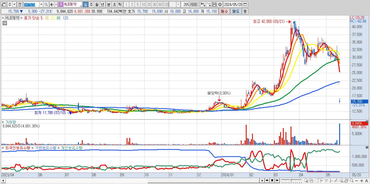 - HLB제약 (15,700원 ▼ -27.31% , 시총: 4,987억, 거래량: 9,844,620, 거래대금:1,546억)