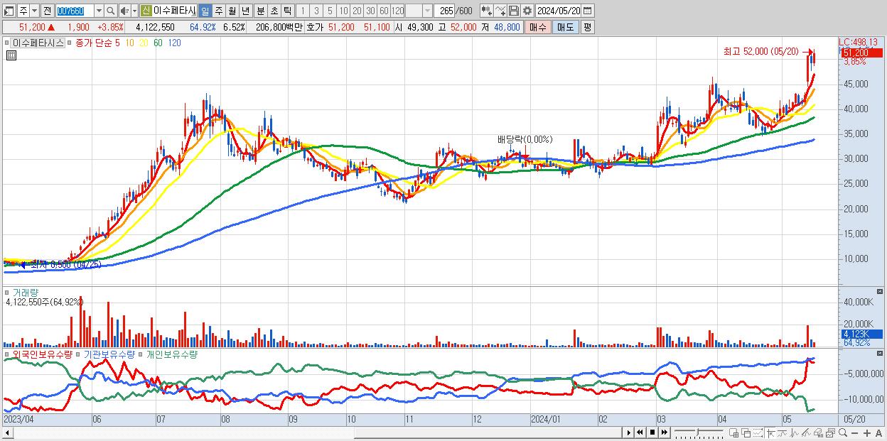 - 이수페타시스 (51,200원 ▲ 3.85% , 시총: 32,382억, 거래량: 4,122,550, 거래대금:2,068억)