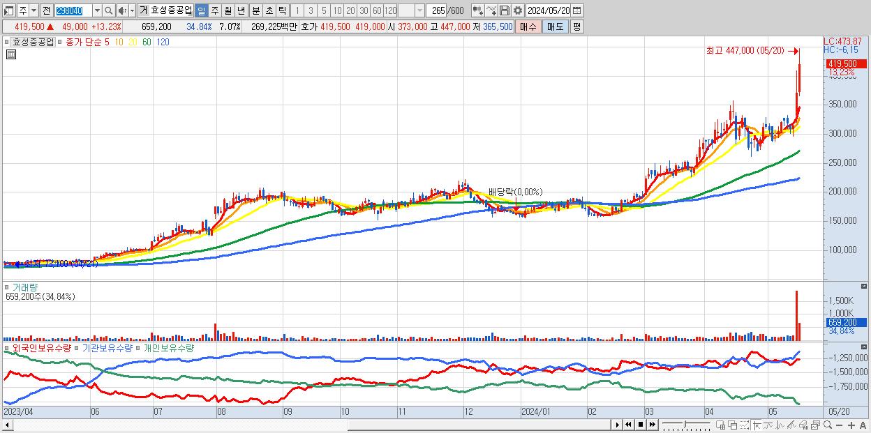 - 효성중공업 (419,500원 ▲ 13.23% , 시총: 39,116억, 거래량: 659,200, 거래대금:2,692억)