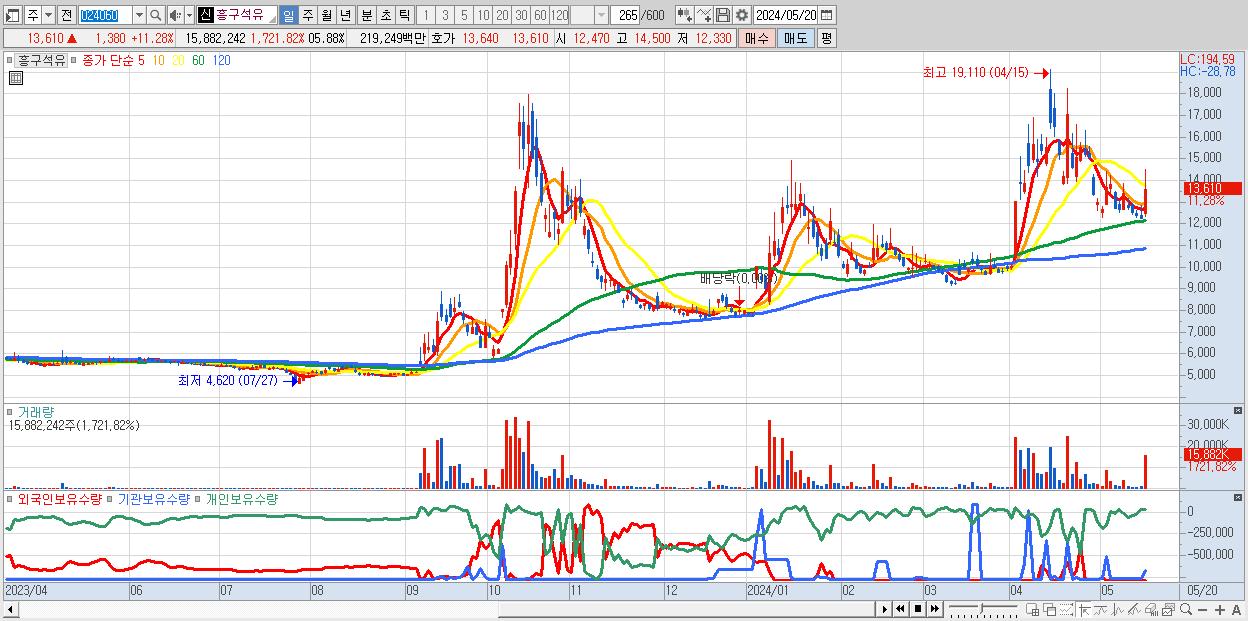 - 흥구석유 (13,610원 ▲ 11.28% , 시총: 2,042억, 거래량: 15,882,242, 거래대금:2,192억)