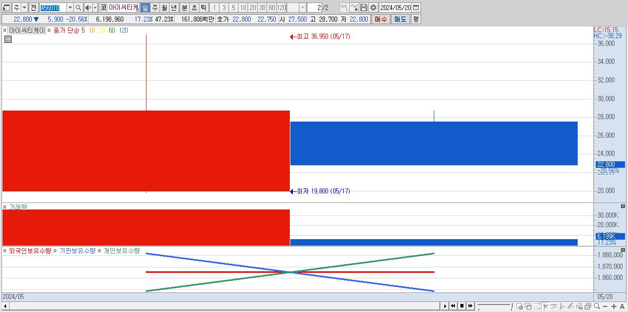 - 아이씨티케이 (22,800원 ▼ -20.56% , 시총: 2,992억, 거래량: 6,198,960, 거래대금:1,618억)