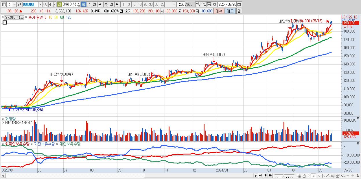 - SK하이닉스 (190,100원 ▲ 0.11% , 시총: 1,383,932억, 거래량: 3,592,128, 거래대금:6,846억)