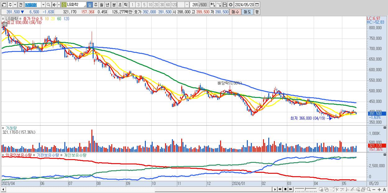 - LG화학 (391,500원 ▼ -1.63% , 시총: 276,369억, 거래량: 321,170, 거래대금:1,263억)
