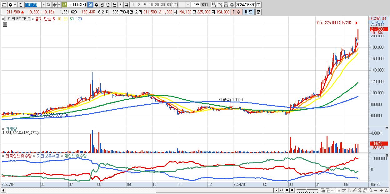 - LS ELECTRIC (211,500원 ▲ 10.16% , 시총: 63,450억, 거래량: 1,861,629, 거래대금:3,968억)
