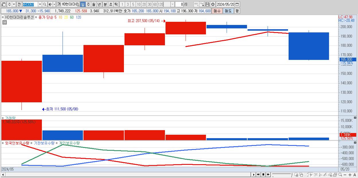 - HD현대마린솔루션 (165,000원 ▼ -15.94% , 시총: 73,343억, 거래량: 1,749,222, 거래대금:3,129억)