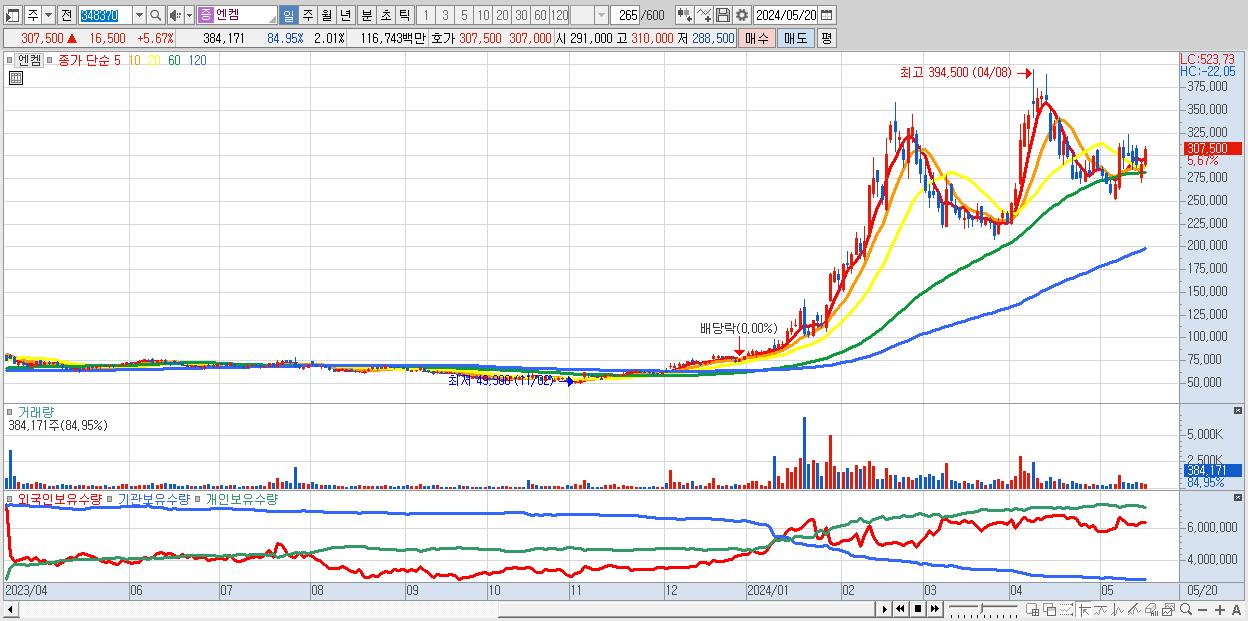 - 엔켐 (307,500원 ▲ 5.67% , 시총: 58,700억, 거래량: 384,171, 거래대금:1,167억)