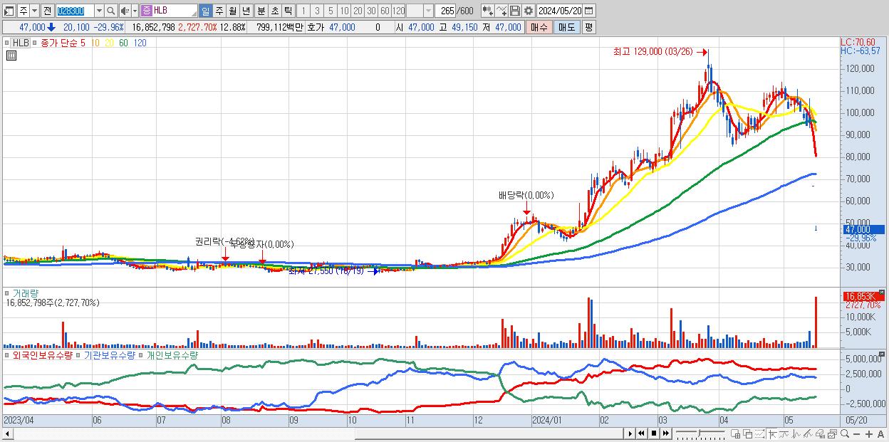 - HLB (47,000원 ▼ -29.96% , 시총: 61,497억, 거래량: 16,852,798, 거래대금:7,991억)
