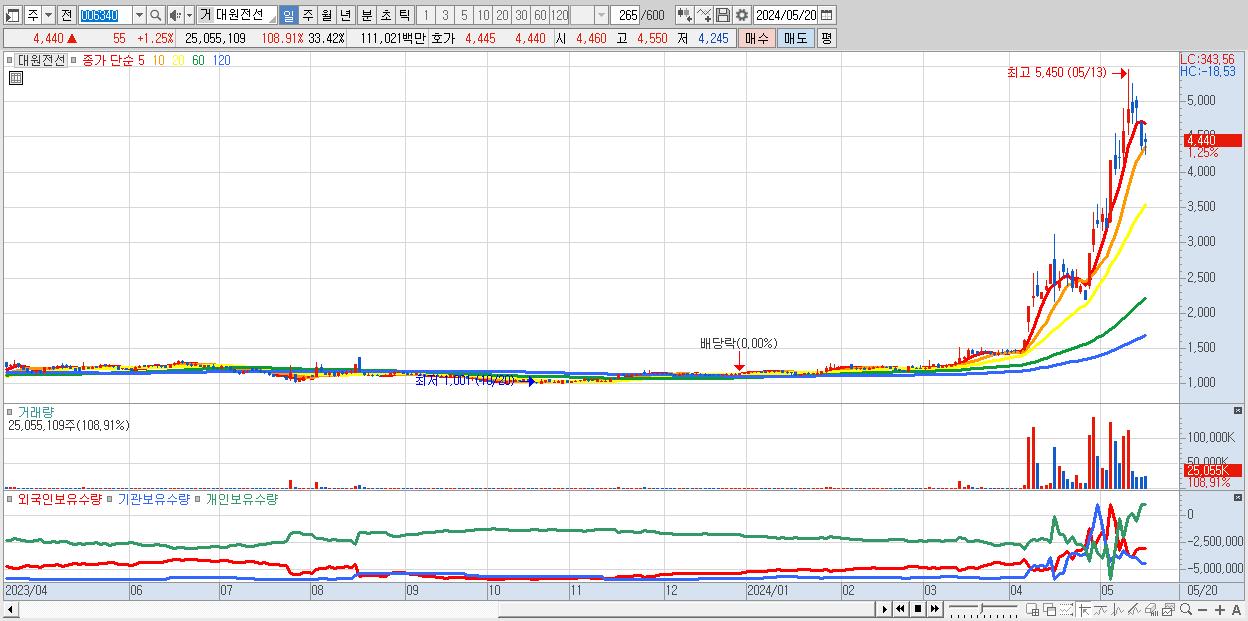 - 대원전선 (4,440원 ▲ 1.25% , 시총: 3,329억, 거래량: 25,055,109, 거래대금:1,110억)