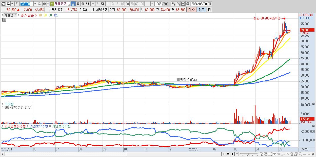 - 제룡전기 (69,800원 ▲ 2.95% , 시총: 11,212억, 거래량: 1,563,427, 거래대금:1,111억)