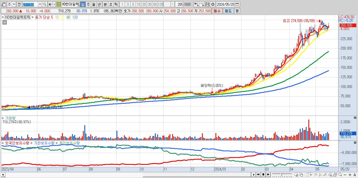 - HD현대일렉트릭 (260,000원 ▲ 4% , 시총: 93,723억, 거래량: 710,279, 거래대금:1,854억)