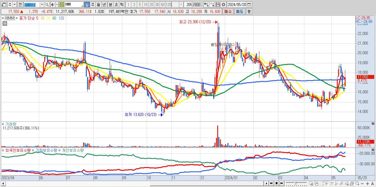 - HMM (17,550원 ▲ 8.47% , 시총: 120,926억, 거래량: 11,217,606, 거래대금:1,975억)