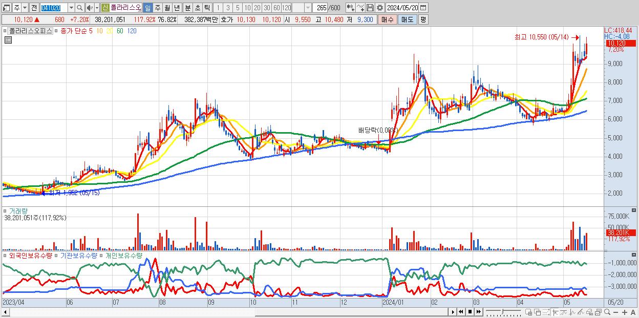 - 폴라리스오피스 (10,120원 ▲ 7.2% , 시총: 5,032억, 거래량: 38,201,051, 거래대금:3,824억)