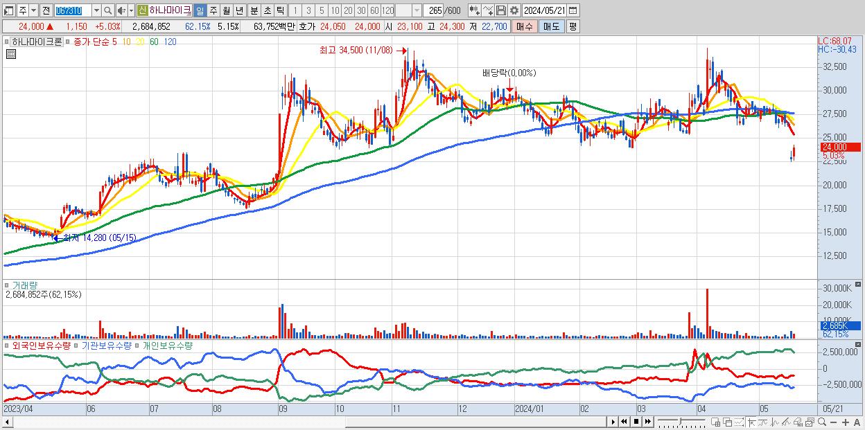 - 하나마이크론 (24,000원 ▲ 5.03% , 시총: 12,521억, 외국인 순매수 거래금:114억)
