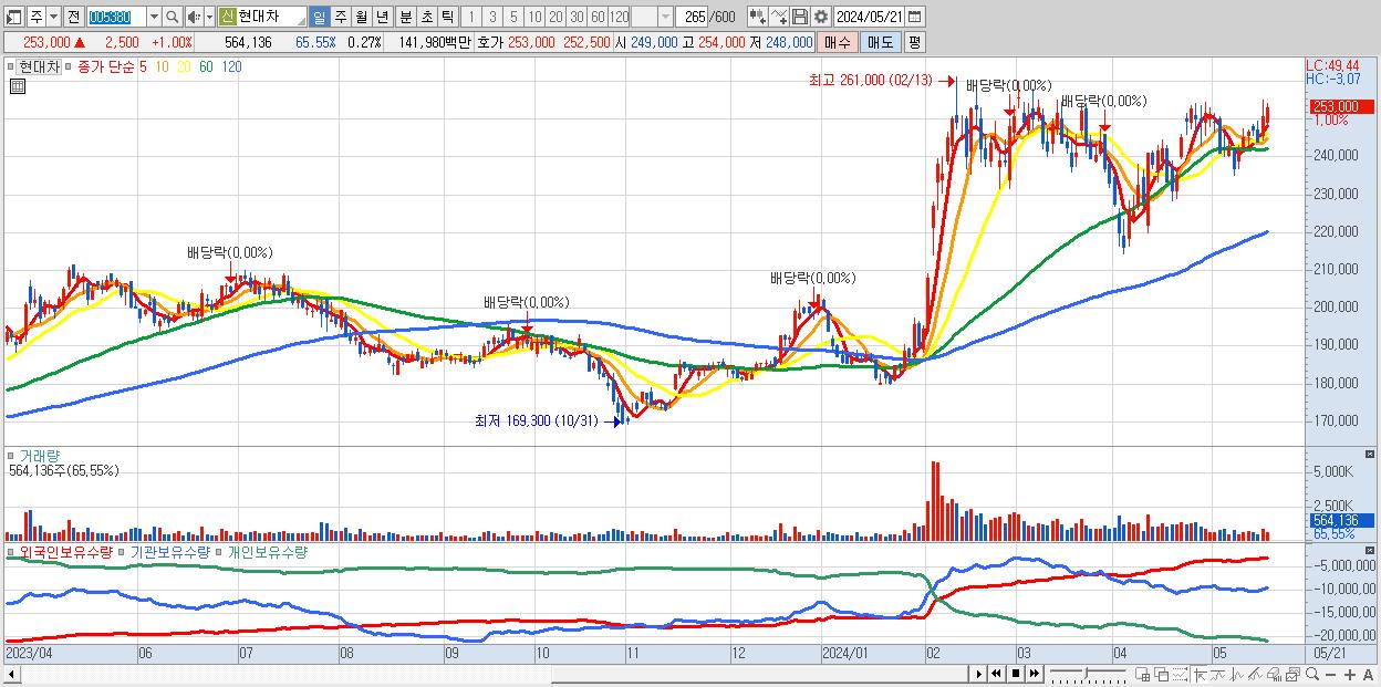 - 현대차 (253,000원 ▲ 1% , 시총: 529,823억, 외국인 순매수 거래금:267억)