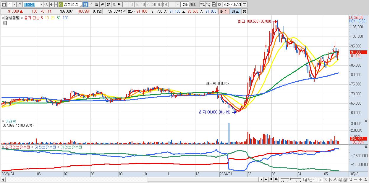 - 삼성생명 (91,800원 ▲ 0.11% , 시총: 183,600억, 외국인 순매수 거래금:111억)