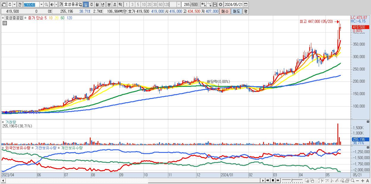 - 효성중공업 (419,500원 0% , 시총: 39,116억, 외국인 순매수 거래금:78억)