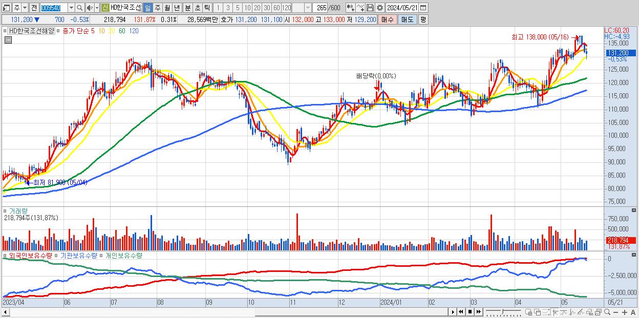 - HD한국조선해양 (131,200원 ▼ -0.53% , 시총: 92,854억, 외국인 순매수 거래금:49억)